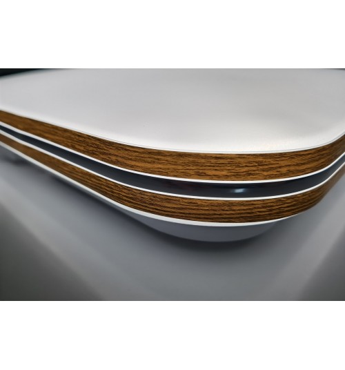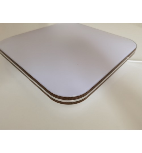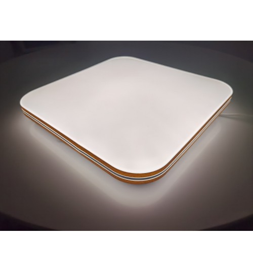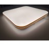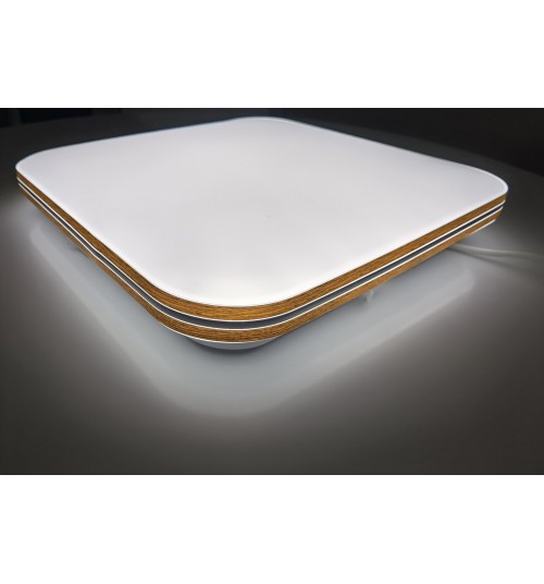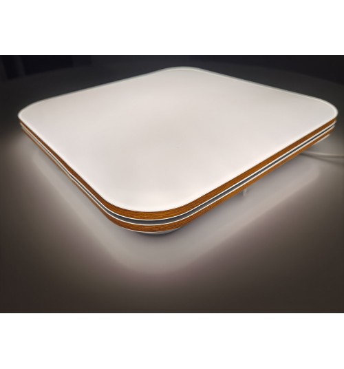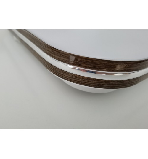 Светодиодная люстра-светильник с элементами декора под орех с хромированной полосой по центру будет отлично дополнять комнату как с высокими, так и с низкими потолками, якрий свет компактные формы и управления яркостью с пульта д/у делают данные светильники универсальными.