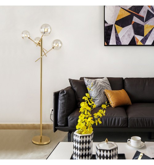 Стильный торшер в стиле модерн для декоративной подсветки вашего помещения с 4мя источниками света и стеклянными плафонами. Корпус выполнен из металла и имеет окрас цвета золота.
